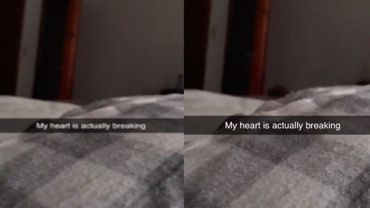 The mom-to-be recorded her baby bump as she laid on a bed, and shared it to Snapchat, captioning it "My heart is actually breaking" because she recently had to put one of her cats down and her other cat can be heard crying in the video. What she didn't notice was a terrifying figure pop up at the end of the clip.